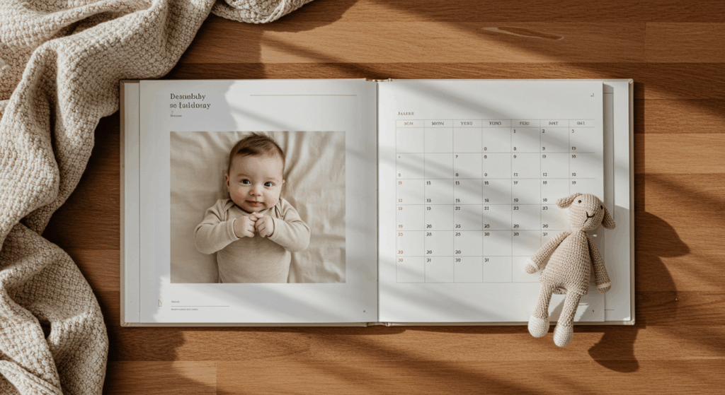 Uma ideia encantadora é repetir mensalmente a mesma foto, criando uma régua de crescimento: pode ser na mesma poltrona, ao lado de um bichinho de pelúcia, ou em um tapete com o cartão de cada mês. Esse padrão dá unidade ao álbum e torna visível a transformação do bebê ao longo do ano.