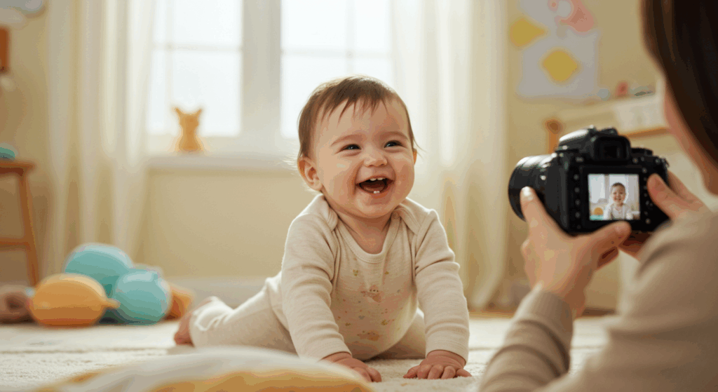 Um truque que quase sempre funciona é dizer, em tom divertido: “não sorria!”. Essa pequena provocação ativa o instinto natural de contradição e acaba gerando sorrisos involuntários, principalmente a partir dos dois anos. Quanto mais leve e bem-humorada for a abordagem, mais espontâneo será o resultado.